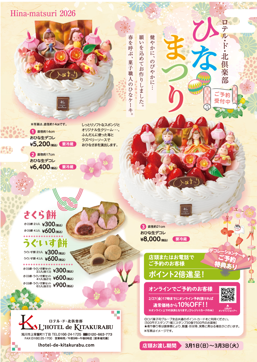 お引き取り期間は3月1日(日)から3月3日(火)まで。ご都合のよいお引き取り店舗と日時をご注文の際にご指定ください。お引き取り店舗は、旭川市内の「The Sun 蔵人」「ロテル・ド・北倶楽部」「ヴィバ・ロバ」各店となります。