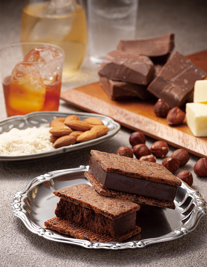 チョコレート(ベルギー)、植物油脂、バター、砂糖、小麦粉、アーモンドパウダー、洋酒、脱脂粉乳、米粉、卵黄、鶏卵、バターミルクパウダー、水飴、ヘーゼルナッツ、ココアパウダー、ブラウンシュガー、大豆粉、食塩 / 香料、乳化剤、酸化防止剤(V.E)、(一部に小麦・卵・乳成分・アーモンド・大豆を含む)
